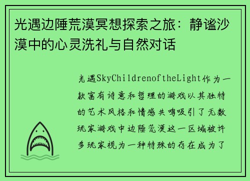 《剑灵》大漠进化石作为游戏中的重要资源之一,对于玩家提升角色属性、强化装备、提高战力有着至关重要的作用。如何获取和使用这些进化石,是许多玩家关注的焦点。本文将从大漠进化石的获取途径、使用方法、注意事项以及进化石的优化策略四个方面,对其获取技巧及使用攻略进行全面解析,帮助玩家更好地理解并利用这一资源。...